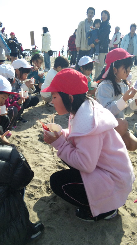レース終了後には郷土の特産物を思い出に残してもらおうと、御宿観光協会とPTAの方々が伊勢海老汁を生徒達にふるまっていました。子供達も喜んで美味しそうに飲み干していました。素晴らしい秋の風景でしたo(^-^)o