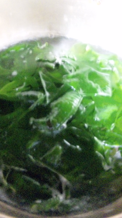 写メにあるようにとれたてのワカメは茶色ですが、お湯に入れたとたんに真っ青な緑に変わります(゜▽゜)この綺麗な緑がまた食欲をそそります!!