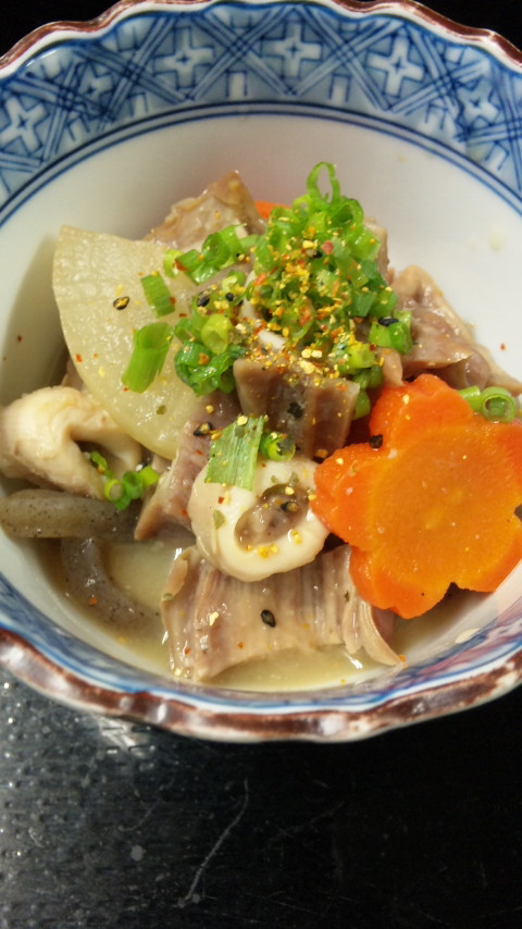 ほとんど市場には出回らないカジキマグロの肝です!カジキの胃と腸をもつ煮のように煮ました。一見もつ煮のようですがもつ煮と違った食感と味わいが有り、酒飲みにはたまらない酒の肴です(^O)=3