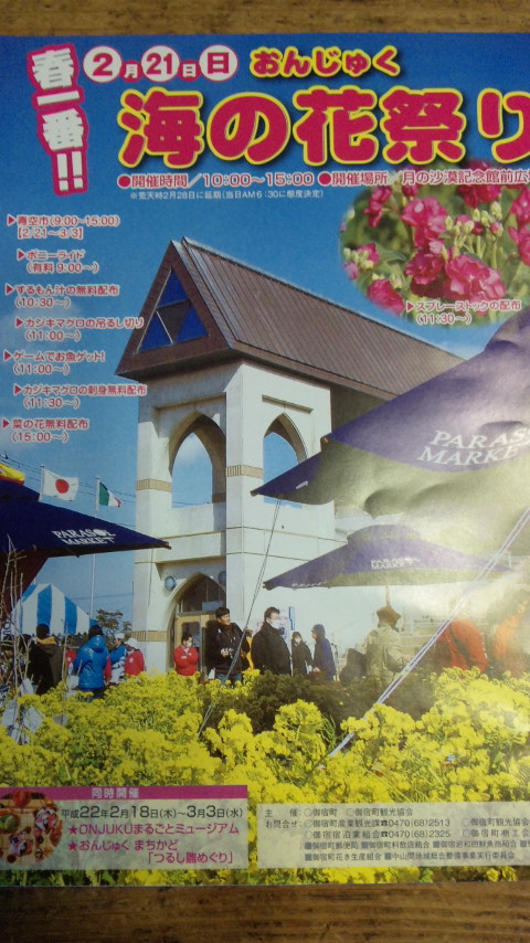 明日御宿では海の花祭りというイベントがあります。青空市やするもん汁の無料配分やゲームでお魚ゲット!、菜の花無料配分といろいろやってます。なかでもカジキマグロ一本をまるごと吊し切りで刺し身にするのは圧巻です\^o^/