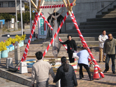 一番の見どころは2メートル近くある大きな「カジキマグロ」をつるしてさばく、つるし切りが行われました。